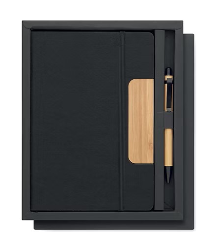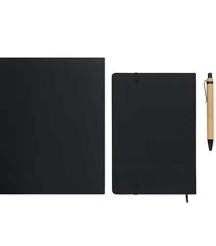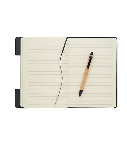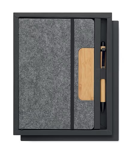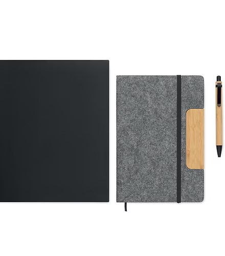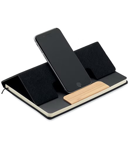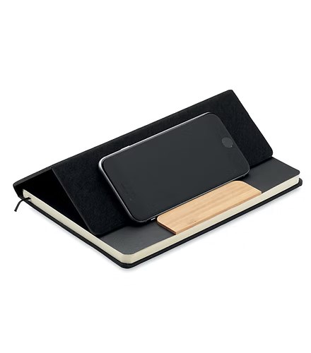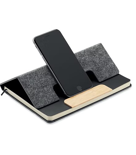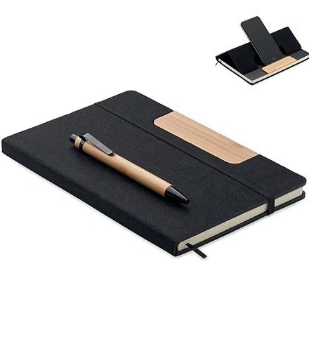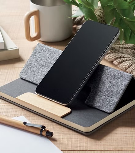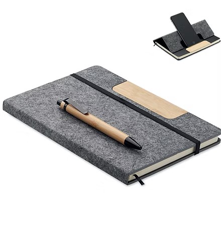 A5 RPET felt hard cover notebook set with phone stand functionality and push ball pen with bamboo barrel. Case bound. 160 recycled paper lined pages (80 sheets). Elastic closure strap. Ribbon bookmark. Blue ink.