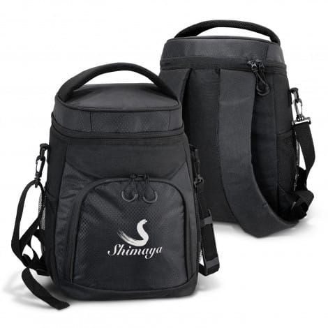 Premium 18L cooler backpack with robust design and excellent functionality. It is manufactured from a stunning combination of patterned 420D ripstop polyester and 600D polyester. The main compartment has thick PE foam insulation encased in a water-resistant PEVA inner liner. This sophisticated backpack has adjustable padded shoulder straps, a removable shoulder sling, a padded carry handle, two mesh side pockets and a large zippered front pocket.