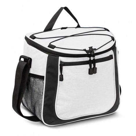 Impressive 13L cooler bag with thick PE foam insulation encased in a water-resistant PEVA inner liner. The outer construction is 600D polyester with a large zippered front pocket and two mesh side pockets. Other features include a zippered top closure, smart zipper pulls, a woven carry handle and trendy elastic lacing which is ideal for holding a sweater or light jacket.