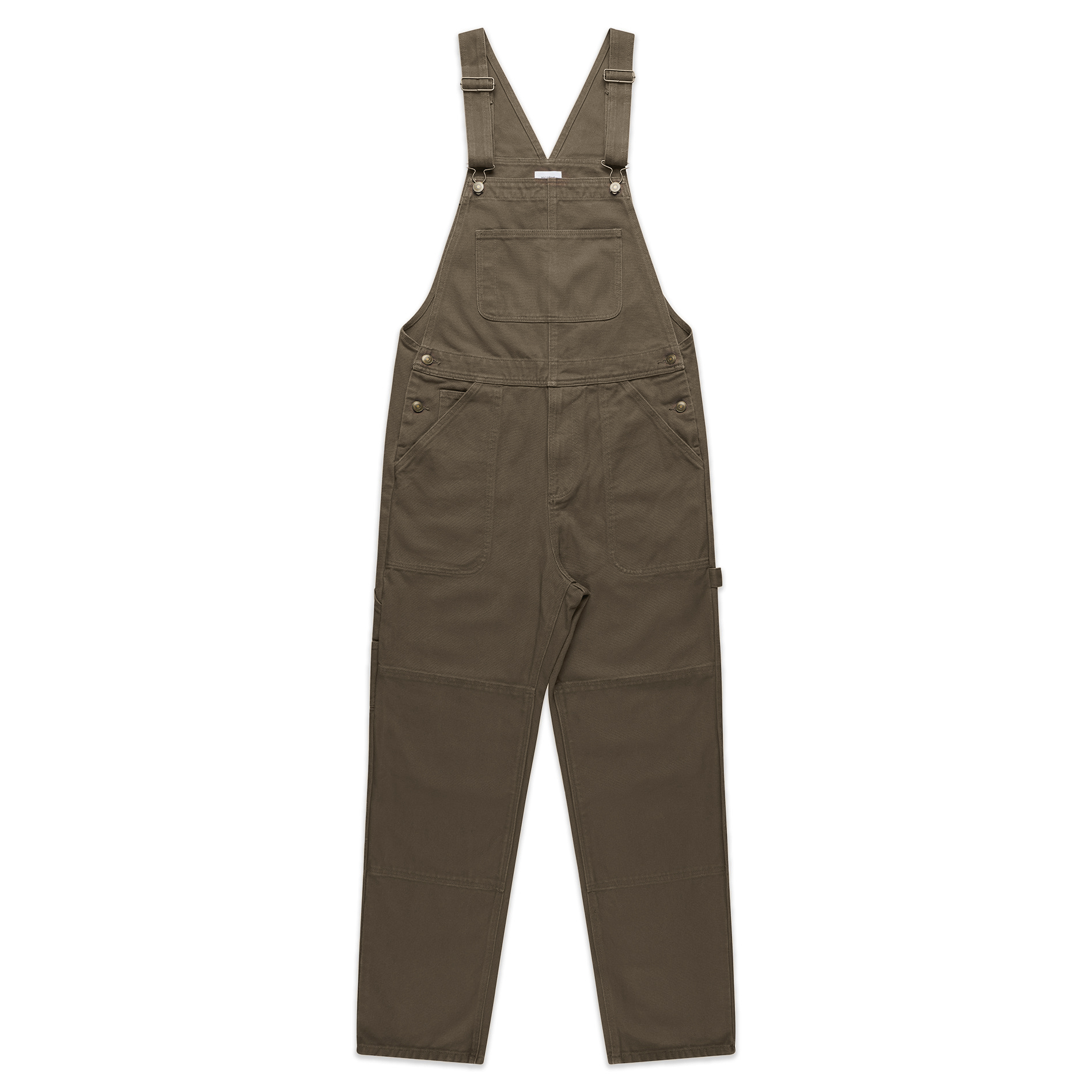 Relaxed-fit overalls made from heavy-weight 365 GSM 100% cotton duck canvas, featuring adjustable shoulder straps with antique black YKK hardware, six pockets, top-stitch detailing, button closure, YKK front zip fly, double patch knees, and pre-shrunk fabric for durability.