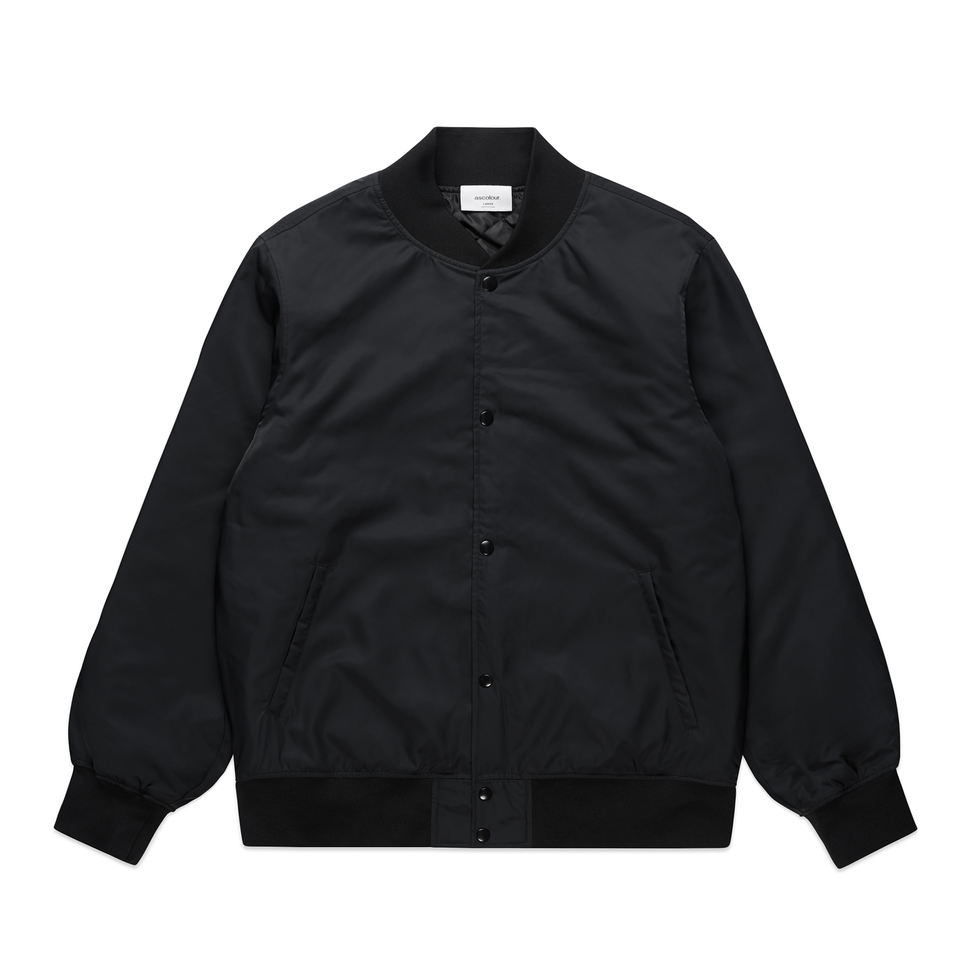 Ribbed collared jacket, two side pockets, YKK snap dome to close, internal patch pocket, ribbed collar, cuffs and hem