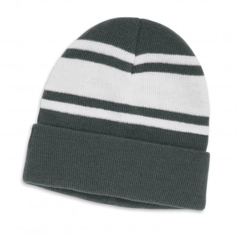 Warm knitted acrylic beanie with a roll up cuff and a striped design. It is available in one size which will fit most people.