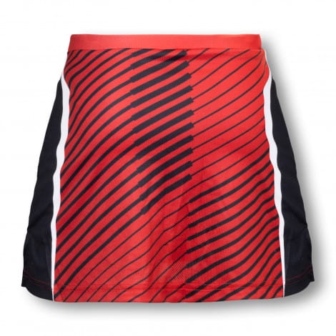 Lightweight custom womens netball skirt manufactured from 150gsm 100% polyester ultra-mesh material which is breathable and soft to touch. The skirt has an elastic waistband with concealed shorts under the skirt. The custom artwork is PMS matched with personalisation free of charge. A production lead time of 35 working days applies to this product.