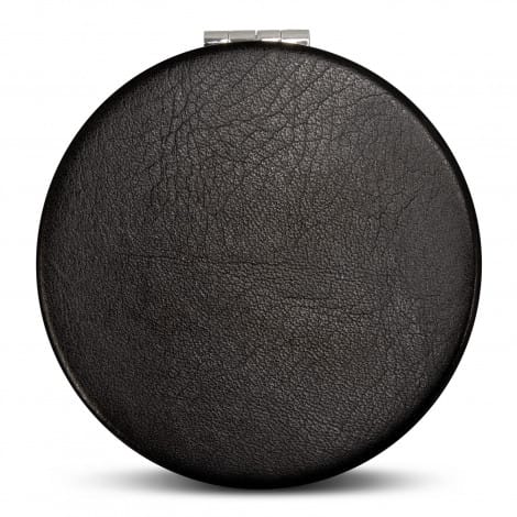 Compact mirror with a hinged cover and black PU exterior. Essence features two mirrors with one being a magnification mirror.