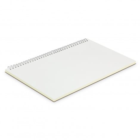 Fully customised A4 size notebook with silver wiro binding and 60 leaves (120 pages) of 70gsm cream paper which is available lined or unlined. Individual pages can be customised in one colour or full colour for an additional cost. The notebook has an 1100gsm unbleached grey cardboard back cover and a 350gsm cardboard front cover which can be branded with stunning edge-to-edge full colour print. A production lead time of 35 working days applies to this product by air freight and larger orders can be sea freighted on request to reduce the freight cost.