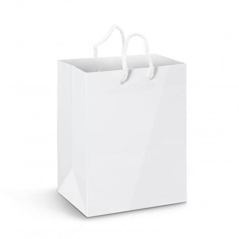 Large paper carry bag with strong woven polypropylene rope handles. It is manufactured from gloss laminated 157gsm art paper and can be branded with stunning edge-to-edge spot colour or full colour printing on all sides including the base. A production lead time of 35 working days applies to this product by air freight and larger orders can be sea freighted on request to reduce the freight cost.