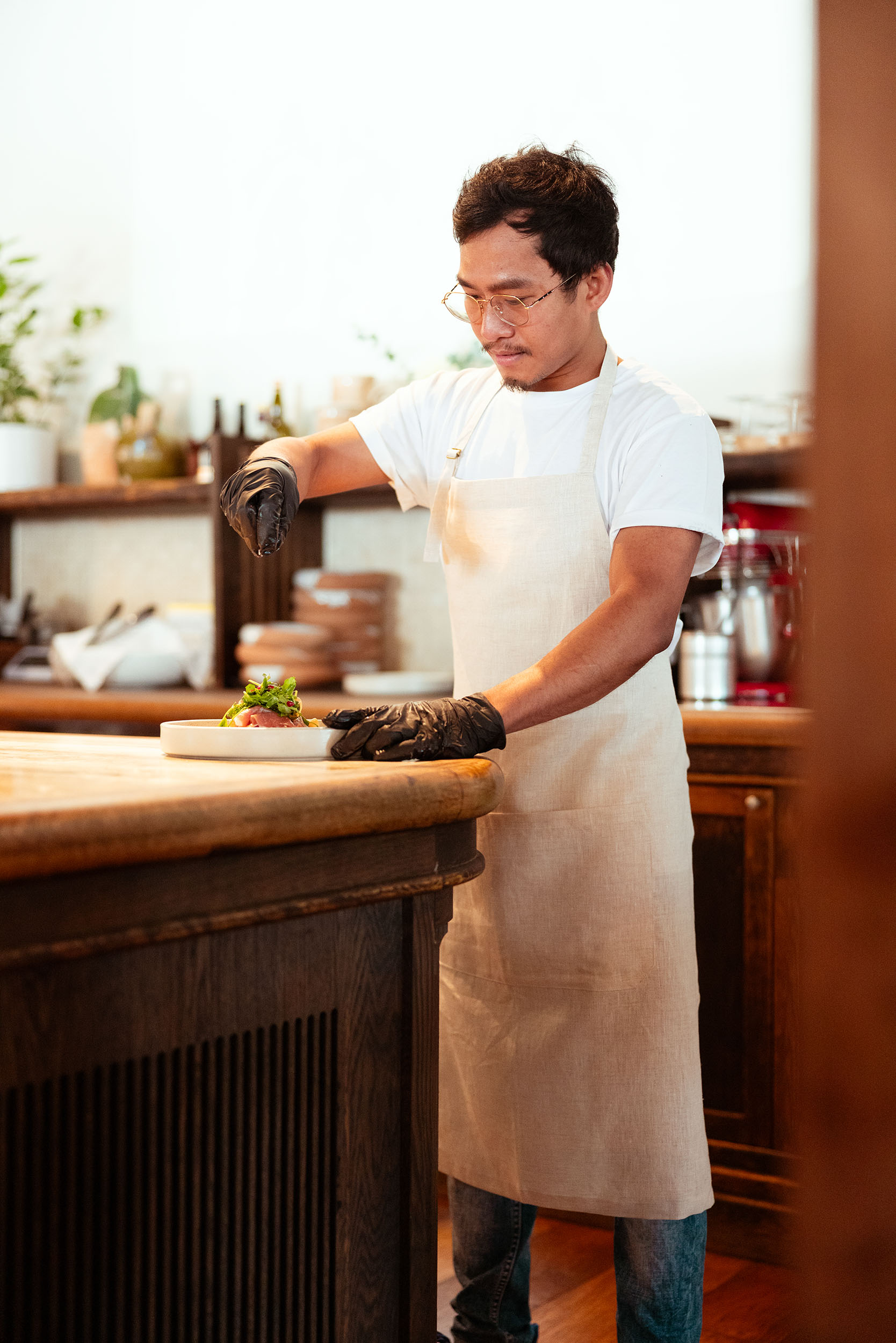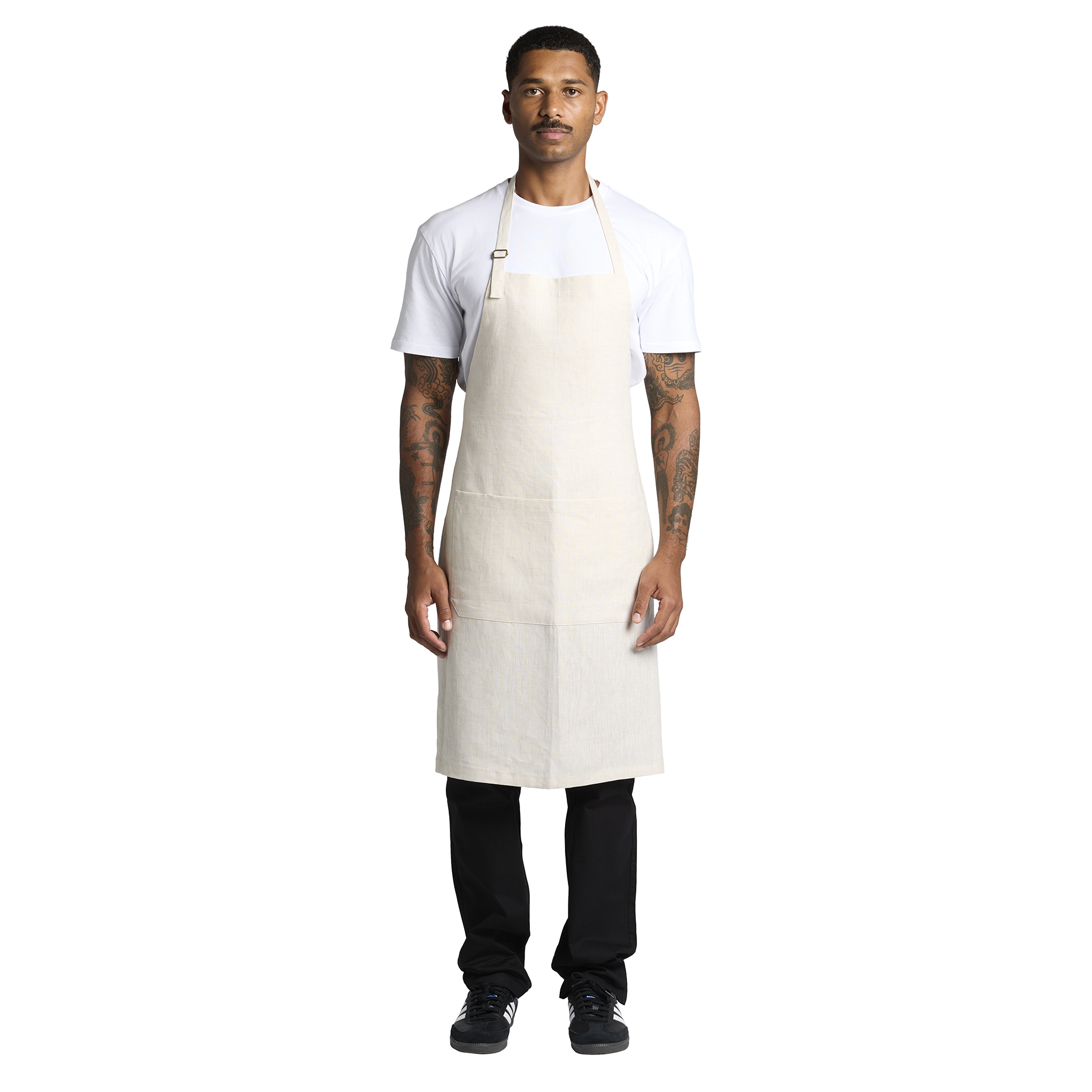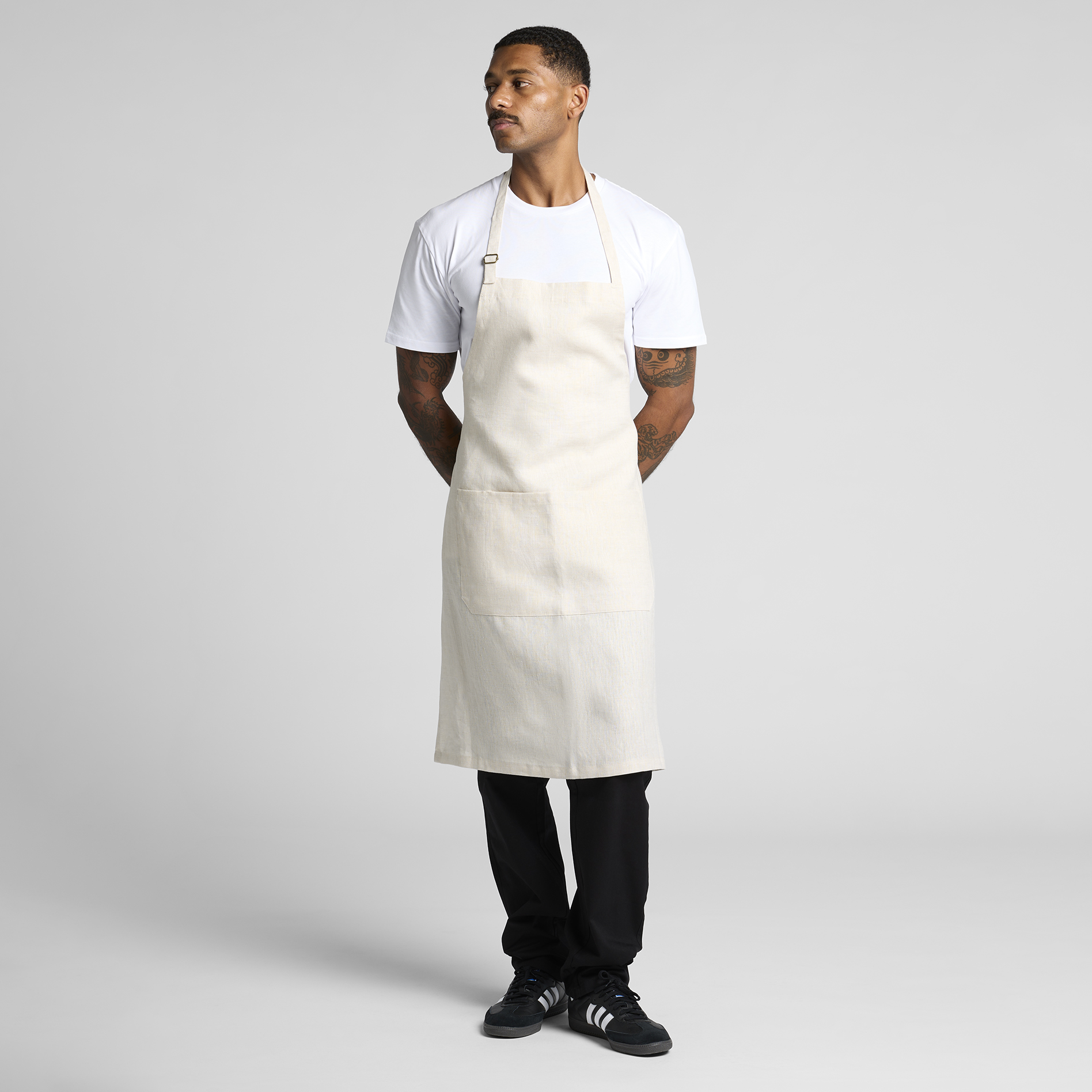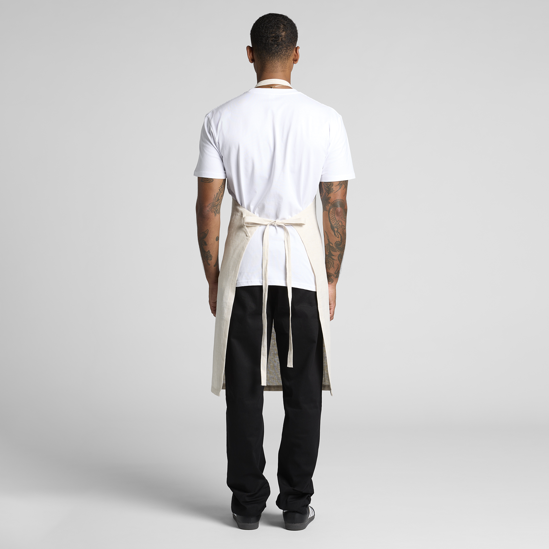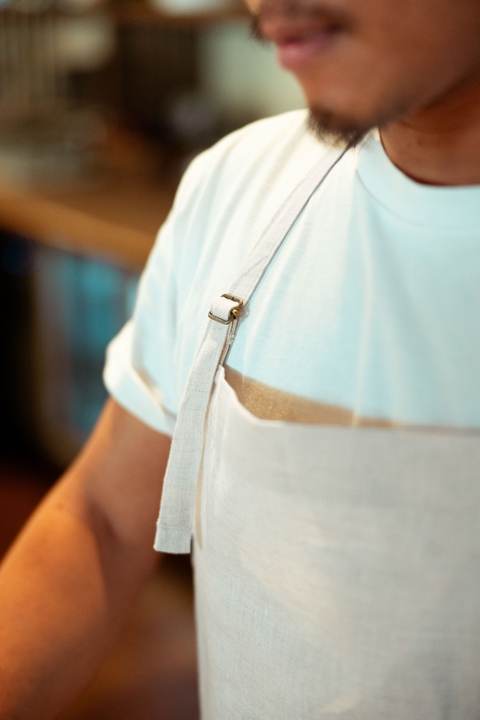 Adjustable shoulder strap, YKK metal strap adjuster, front patch pocket, self fabric waist and neck ties, top stitch detailing