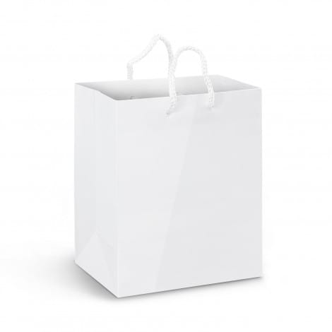 Medium-size paper carry bag with strong woven polypropylene rope handles. It is manufactured from gloss laminated 157gsm art paper and can be branded with stunning edge-to-edge spot colour or full colour printing on all sides including the base. A production lead time of 35 working days applies to this product by air freight and larger orders can be sea freighted on request to reduce the freight cost.