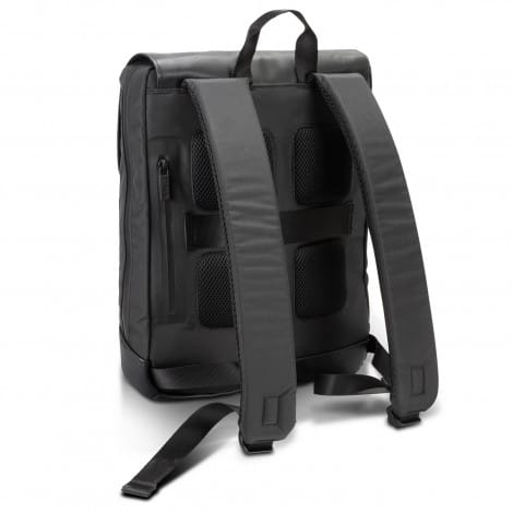 The Moleskine Metro Slim Backpack is an urban lightweight backpack designed to go with you everywhere and carry the day's essentials. This luxury backpack features a flap with magnetic closure and a water-resistant zip to keep all your essentials safe. Inside, the backpack features an organizer, two pen holders, a business card holder, a secure pocket and an inner compartment to protect your laptop. The Metro Slim is fitted with an adjustable padded shoulder strap and breathable air-mesh back for exceptional comfort on the go and a rear luggage sleeve will slide over the handle of a rolling suitcase. A reflective Moleskine logo is sewn onto the leather-look PU base of the backpack. Please note this product cannot be supplied without the Moleskine logo. Moleskine reserves the right to decline any custom project or artwork that does not align with its brand on a case-by-case basis.