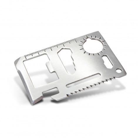 Stainless steel multi-tool that is credit card size and slim enough to fit in a wallet. It features a can opener, a knife edge, a screwdriver, a ruler, a two-position wrench, a four-position wrench, a butterfly wrench, a saw blade and a direction ancillary indicator for navigation. Multi-Tool Card can be used anywhere and is ideal for outdoor activities. It laser engraves to a stainless steel finish and is presented in a compact PU sleeve.