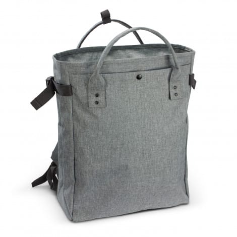 Extra-large tote bag that can also be worn as a backpack. The bag is manufactured from 300D polyester with a two-tone heather style finish. Newport features a zippered top closure, a front slip pocket with a domed closure, and a zipper to access the main compartment from the back of the bag. The bag has a gusset for increased storage, adjustable side straps and padded shoulder straps and carry handles that are riveted to the bag for added strength.