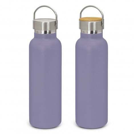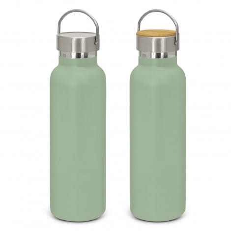 Impressive 650ml BPA-free, double wall, vacuum insulated stainless steel drink bottle which has an extremely durable powder coated matte finish. It will keep drinks cold for 24 hours or hot for up to 12 hours. It has a trendy screw on lid with a stainless steel carry handle that offers a prominent branding opportunity and is available in full stainless steel or with a bamboo veneer. Bamboo is a natural material which produces unavoidable variances in the grain pattern, colour and branding. The lid laser engraves to a natural etch and the bottle laser engraves to a shiny steel finish. It is nicely presented in a black gift box or an