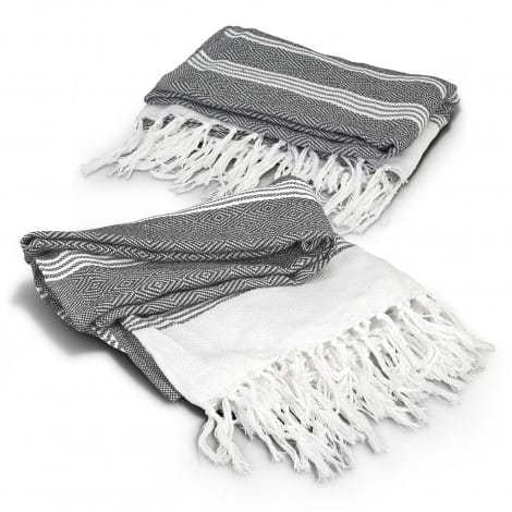 Trendy blanket manufactured from 500gsm 50% Recycled Cotton, 50% polyester. It features a textured square pattern with a fringed trim.