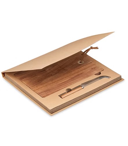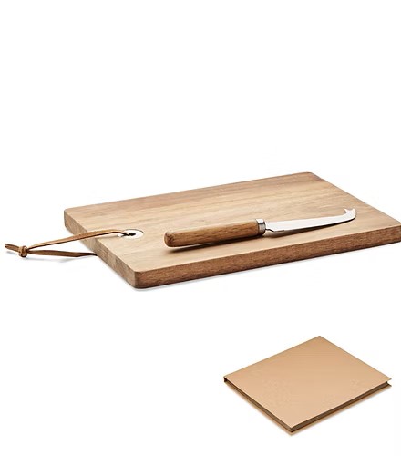 Our Acacia Wood Cheese Board set, complete with a matching knife, is a classic choice for serving cheese and other appetizers. The set is elegantly presented in a corrugated carton gift box, making it an ideal gift or a stylish addition to your own serving collection. Crafted from natural acacia wood, each board features unique variations in color and size, adding individual character and rustic charm to your presentation. This set combines functionality with natural beauty, perfect for any entertaining occasion.