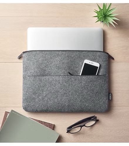 Explore our RPET felt 14-inch zippered laptop bag, a sustainable choice for the eco-friendly professional. This protective sleeve is perfect for carrying your laptop or tablet, featuring a convenient zippered front pocket for easy storage of smaller items like pens or notes. Ideal for office use, this bag is not just functional but also a statement in environmental responsibility, as it’s made from recycled PET plastic. Keep your tech safe and your essentials organized, all while supporting a greener planet with this stylish, recycled laptop bag!