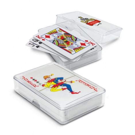 Set of playing cards with a patterned back in a clear acrylic case. Branding is on the acrylic case.