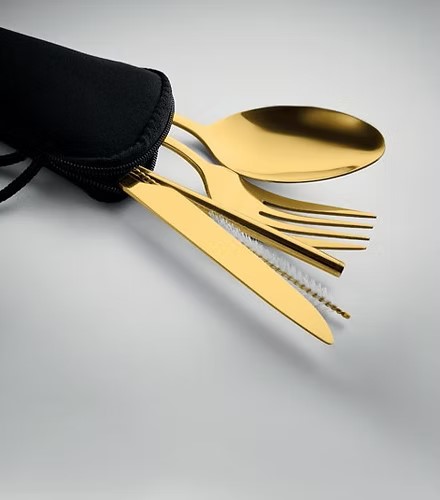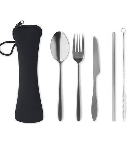 Embrace sustainability with our Reusable Stainless Steel Cutlery Set, perfect for on-the-go meals or bringing lunch to work. This set includes a fork, knife, spoon, straw, and a cleaning brush for the straw. All items conveniently fit in the neoprene pouch with a zipper and closure cord, making it easy to carry and keep clean. Say goodbye to single-use plastic and hello to eco-friendly dining with this handy cutlery set.