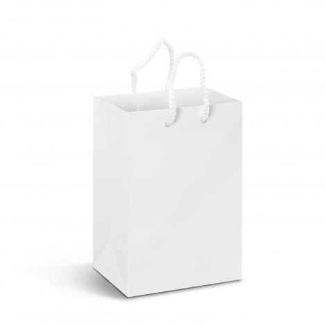 Small paper carry bag with strong woven polypropylene rope handles. It is manufactured from gloss laminated 157gsm art paper and can be branded with stunning edge-to-edge spot colour or full colour printing on all sides including the base. A production lead time of 35 working days applies to this product by air freight and larger orders can be sea freighted on request to reduce the freight cost.