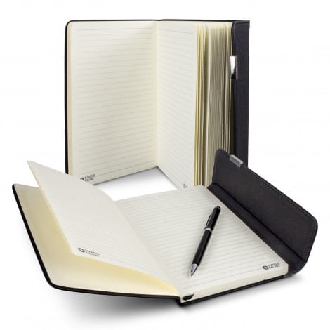 The ultimate gift for writing lovers, the Swiss Peak notebook and pen set is essential. The notebook has a PU cover with a flap magnetic closure with a silver metal logo. With 80 sheets (160 pages) of 80gsm cream lined paper this A5 notebook is the best addition to any creative stationery set. The black metal pen has 1200m of blue German Ink. Laser engraving on this product comes as a stainless steel finish. This luxury notebook and pen set is presented in a deluxe Swiss Peak gift box.