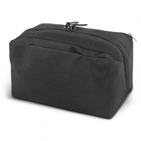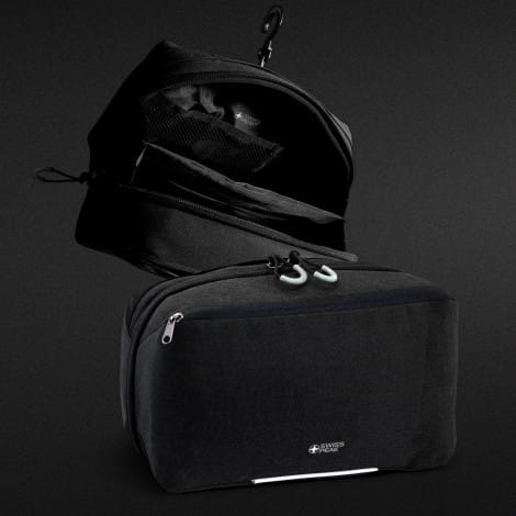 The thoughtfully designed Swiss Peak Toiletry Bag is a luxurious travel accessory with the perfect balance of functionality and simplicity. It is manufactured from polyester and can sit upright or be hung up by a stowable hook for even easier access. The bag has a large zip-around opening with conveniently looped zipper pulls, a zippered side pocket and a woven carry handle. It has a large internal compartment which features a unique, magnetically sealed toothbrush pocket along with three mesh pockets and two slip pockets which keep items organised and clean. The Swiss Peak logo is subtly branded on the front of the bag.
