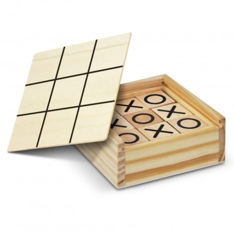 Classic game of Tic Tac Toe where each player tries to be the first to have three noughts or crosses in a row. The game is presented in a pine wood box with a sliding lid which has the game grid printed on the underside. Wood is a natural material which produces unavoidable variances in the grain pattern, colour and branding. It laser engraves to a natural etch.