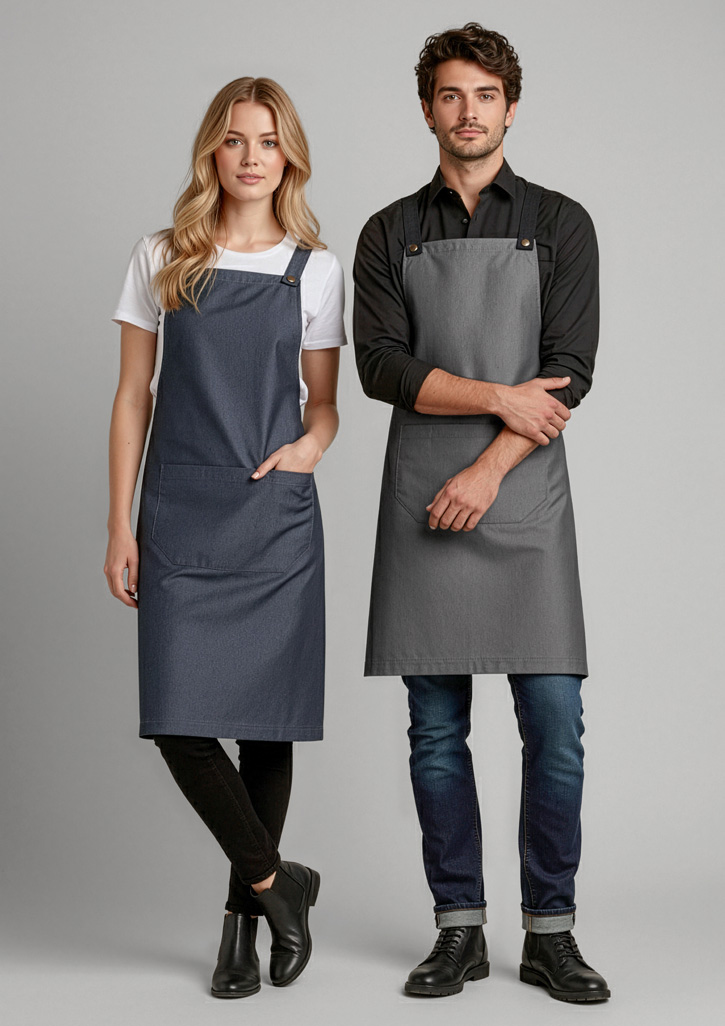 Street-style x-back apron with interchangeable straps, made from durable, colourfast fabric built for busy, demanding environments.