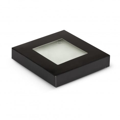 Set of two square glass coasters in an elegant black gift box with a window to show off the brand. The coasters have four non-marking polyurethane pads on the base. Handwashing is recommended.