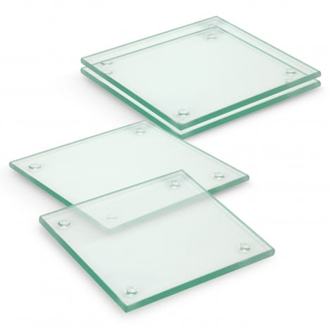 Set of four square glass coasters in a stylish black gift box with a window to show off the brand. The coasters have four non-marking polyurethane pads on the base. The branding is on the underside of the coaster and handwashing is recommended.
