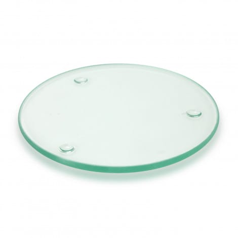 Round glass coaster which is presented in a smart cardboard sleeve. The coaster has three non-marking polyurethane pads on the base. The branding is on the underside of the coaster and handwashing is recommended.