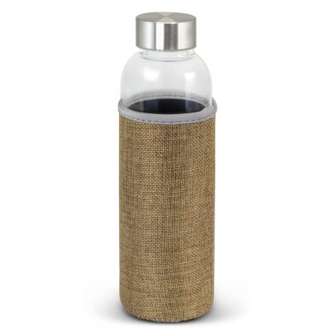 Deluxe 600ml borosilicate glass drink bottle which features an insulating soft poly jute sleeve that helps to keep drinks cool. The sleeve is fashion-inspired textured polyester outer. It has a secure screw-on stainless steel lid which can be laser engraved with a logo. Borosilicate is a lightweight glass that is exceptionally strong and shatter-resistant. Glass is a natural choice for a clean, pure taste and is a safe and reusable plastic alternative. This product is not intended to be used with carbonated or hot liquids. It is not dishwasher safe and handwashing is recommended.