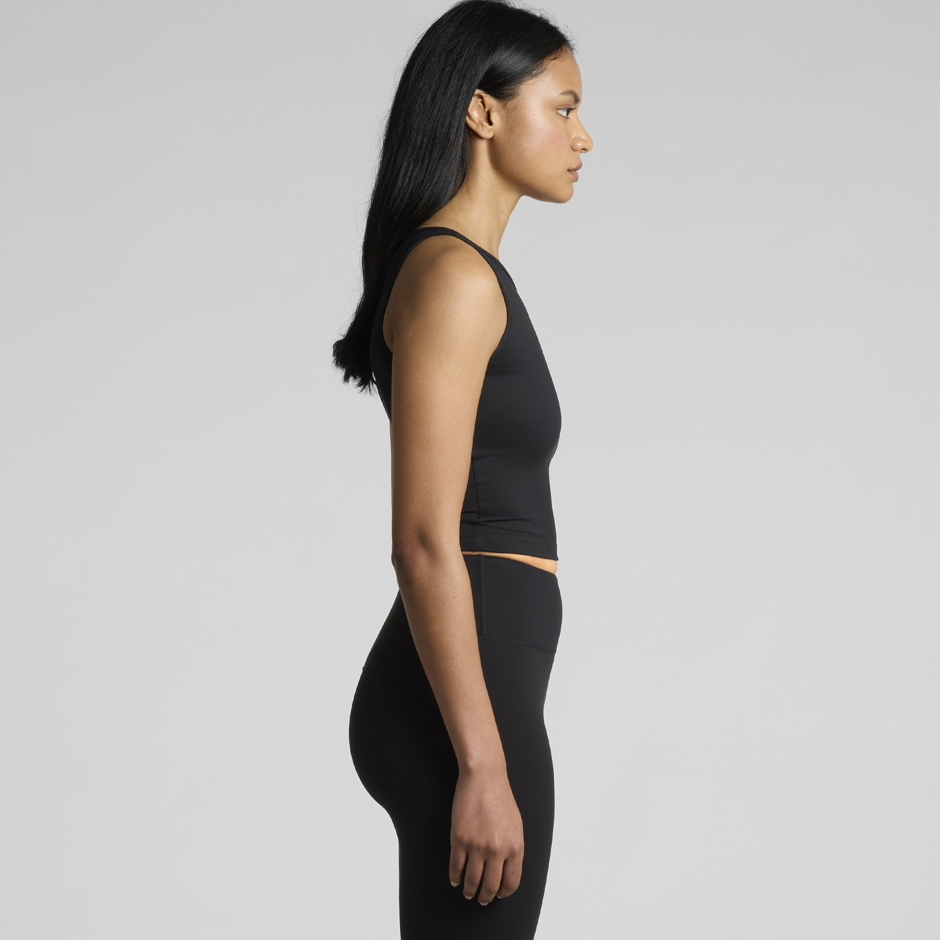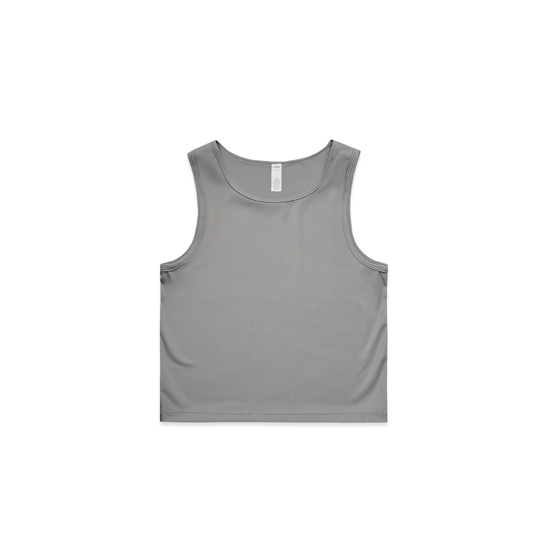 Slim-fit midlength performance top made from 220 GSM recycled nylon–elastane with a matte finish, featuring bound edges, moisture-wicking and quick-dry properties, high stretch for resilience, a tear-out label, and suitability for screen printing and heat pressing.
