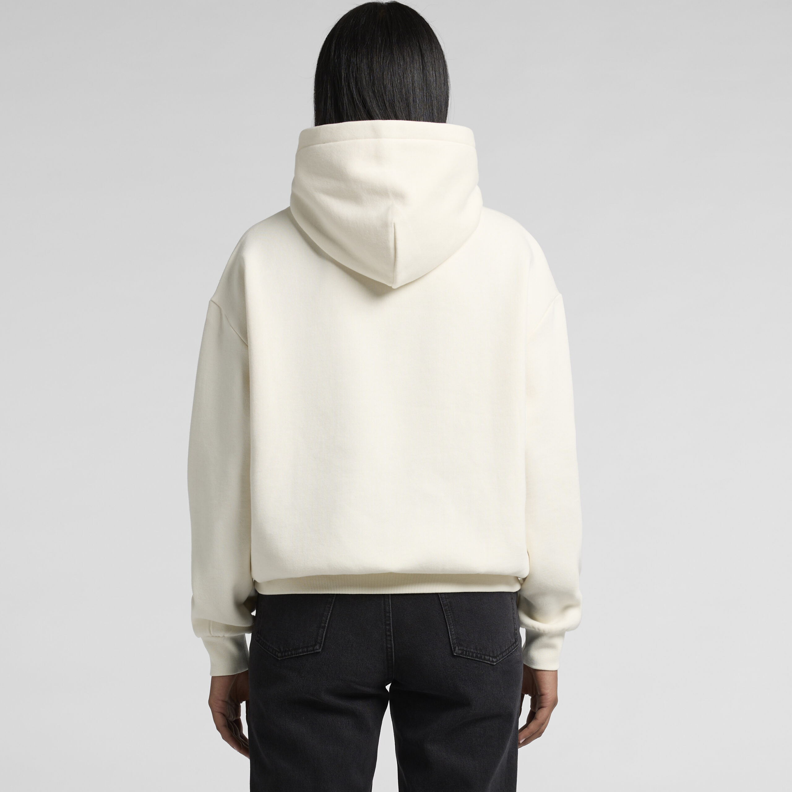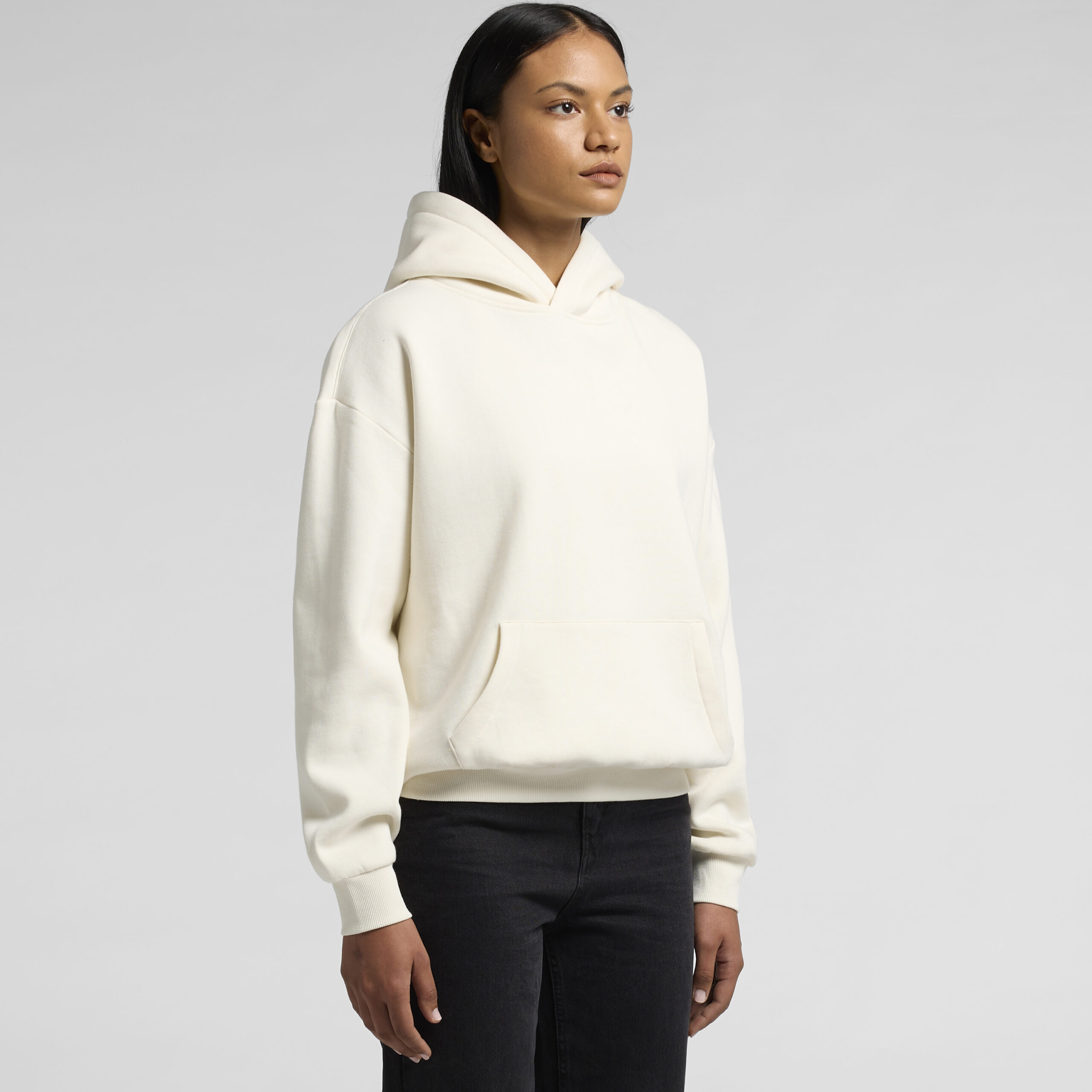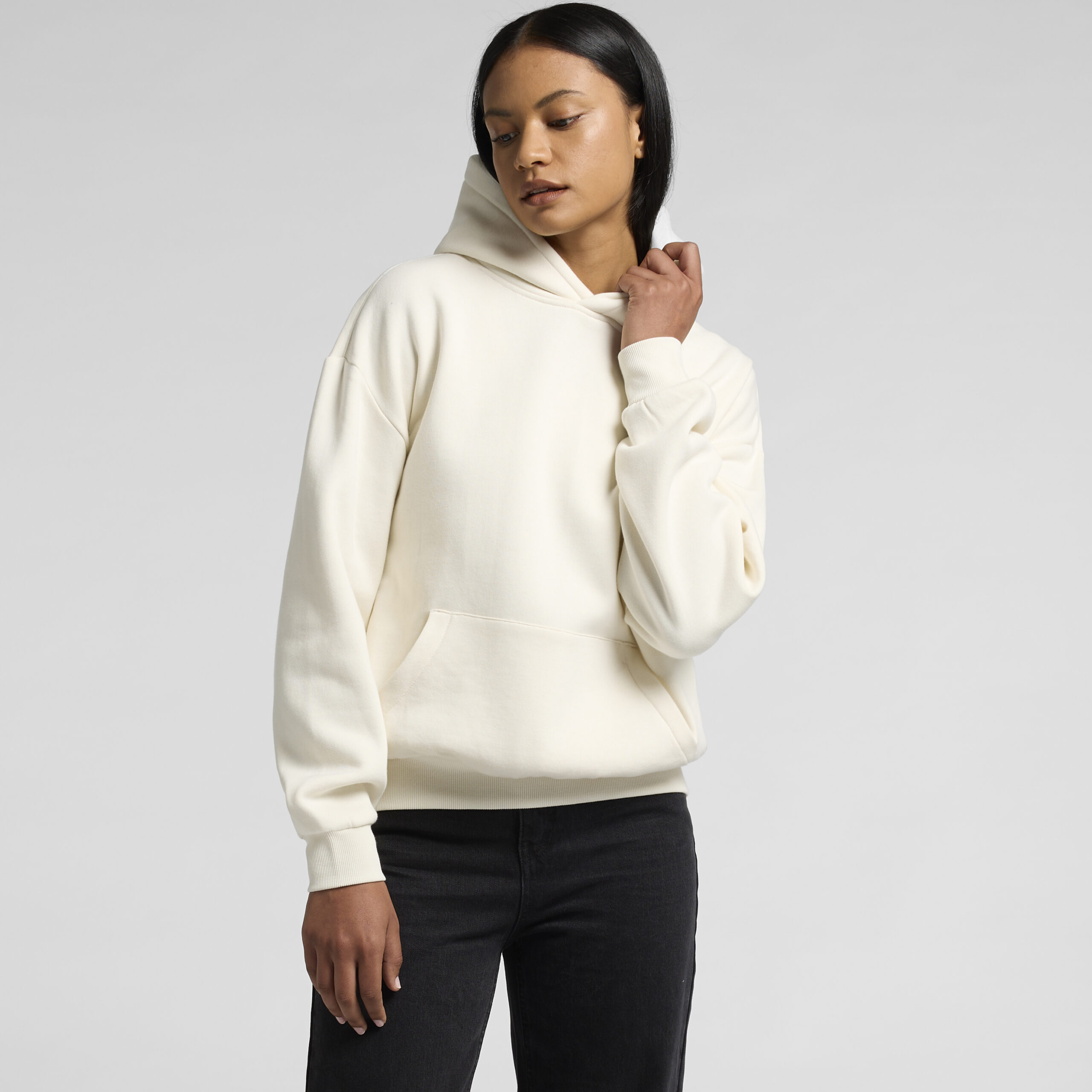 Pullover hood, drop shoulder, inset sleeves, kangaroo pocket, no drawcord, hem and sleeve 2×2 ribbing, self-fabric lined hood, preshrunk to minimise shrinkage
