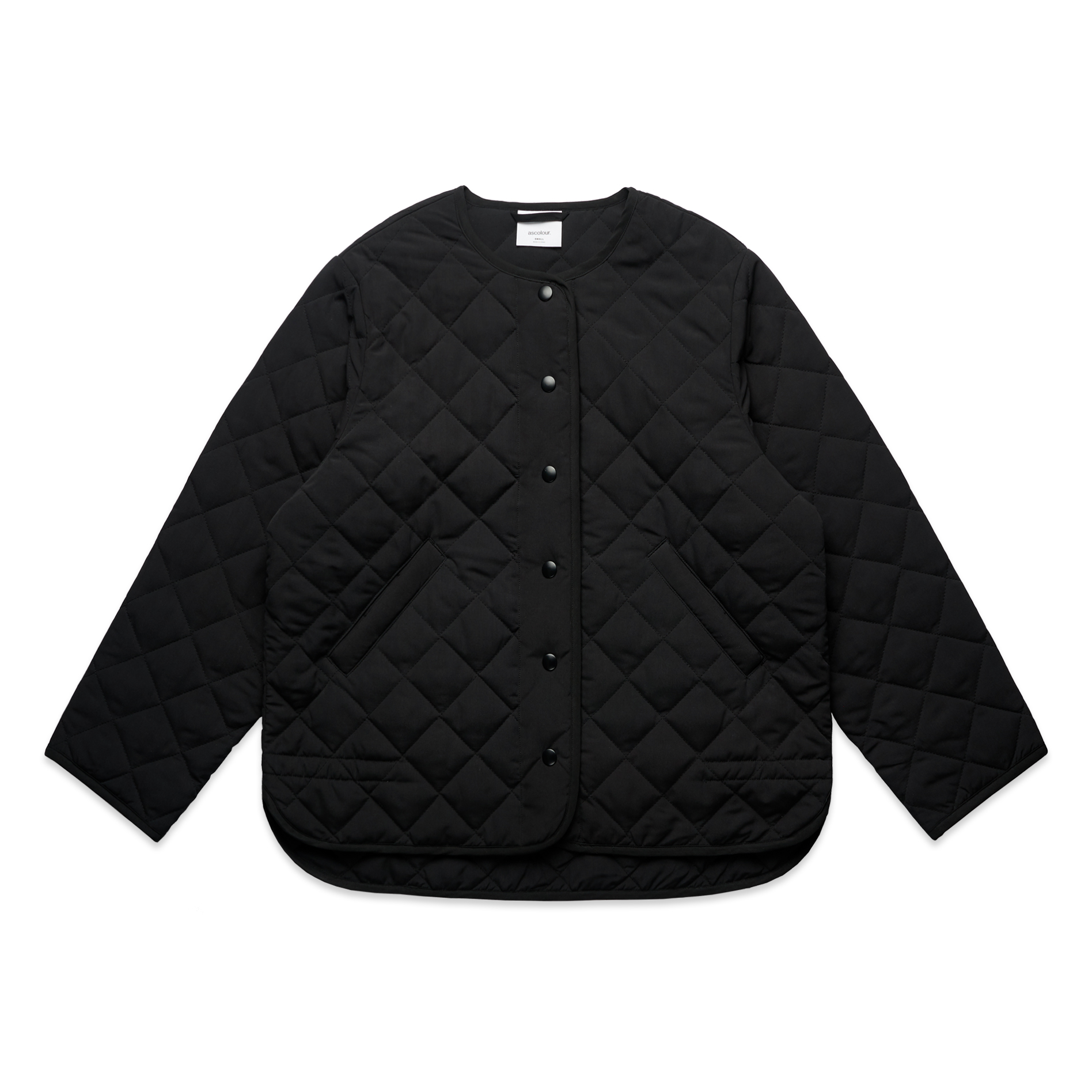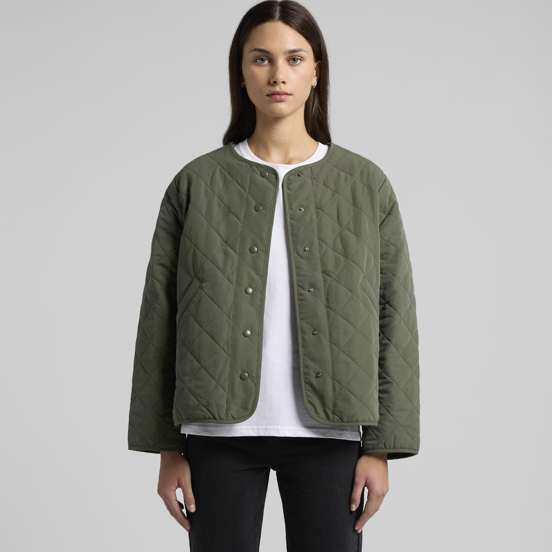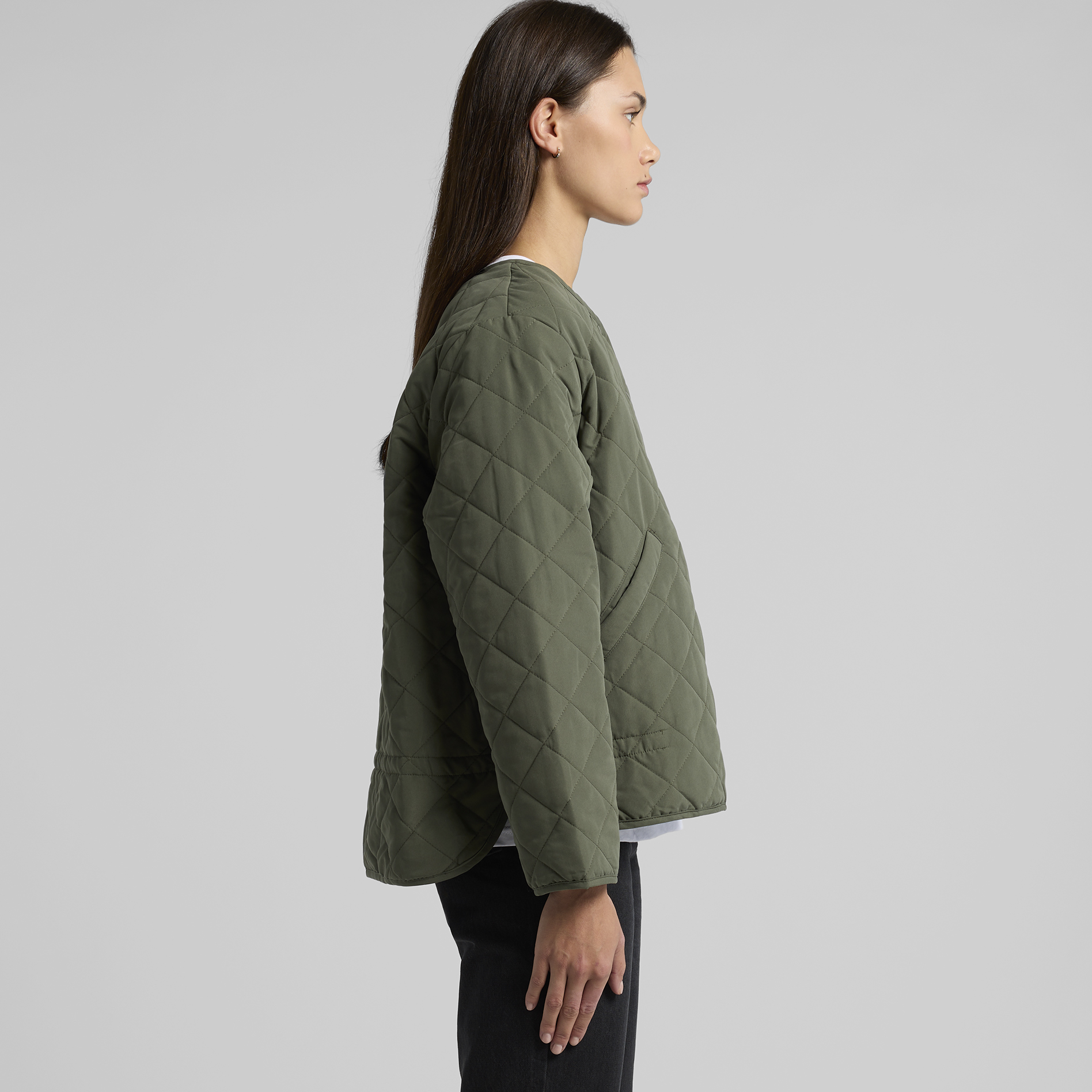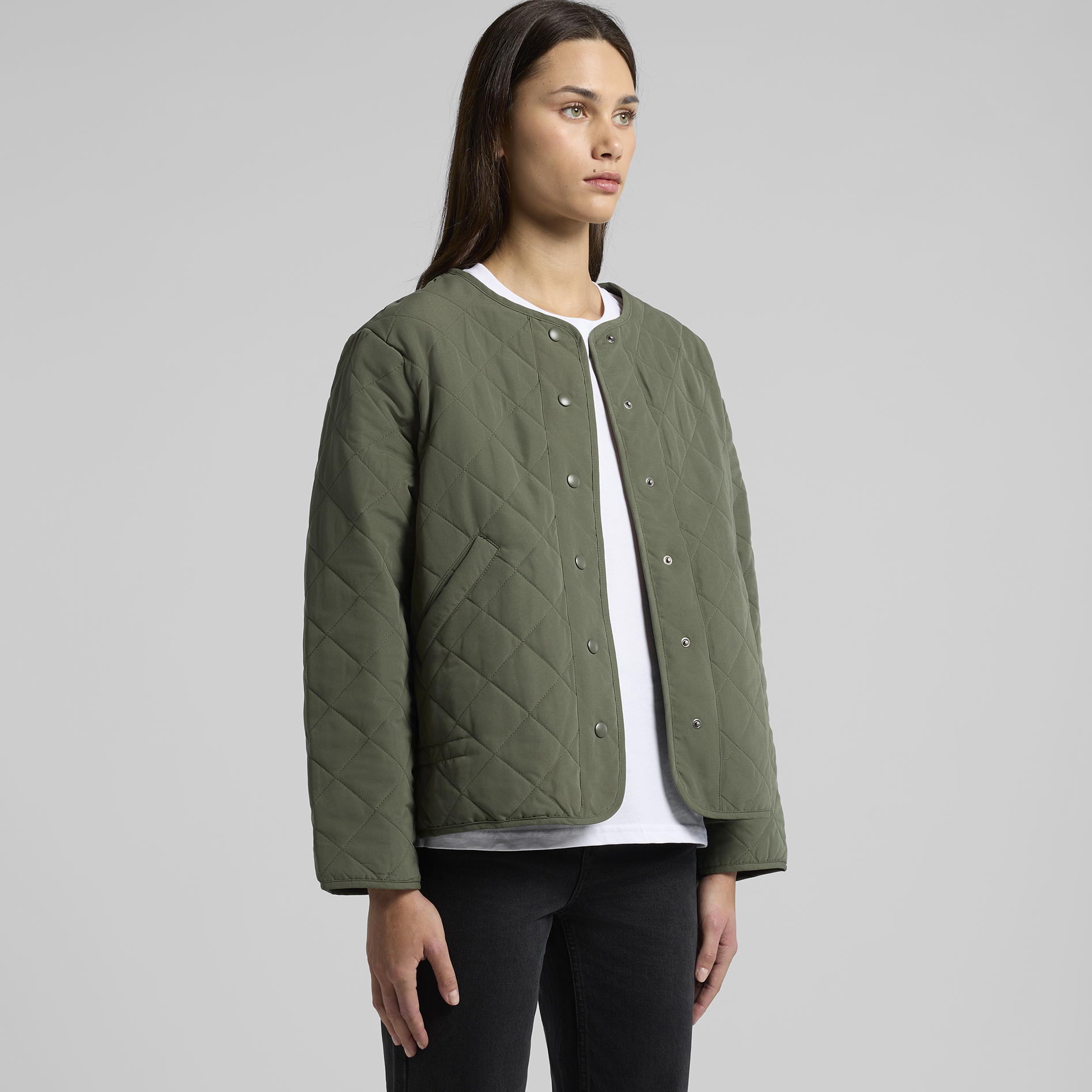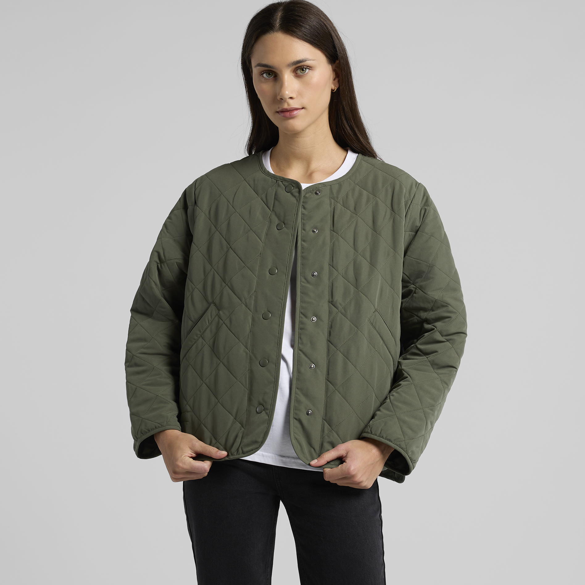The Quilted Jacket is a sustainable, collareless jacket with snap dome closure and side pockets, made from 100% recycled polyester wadding—saving around 89 recycled 500ml plastic bottles from landfill.