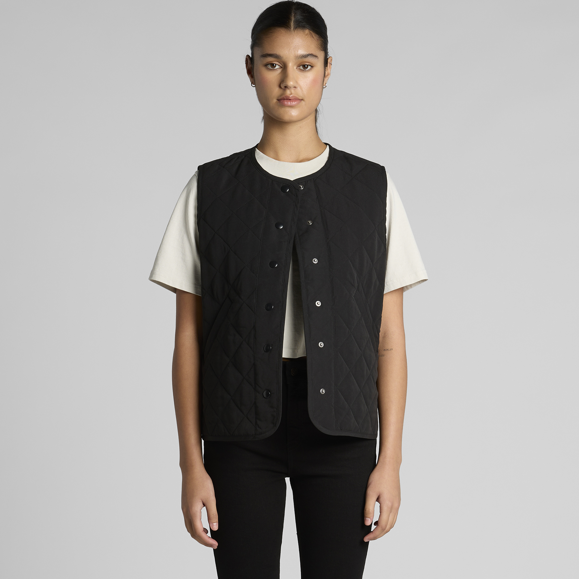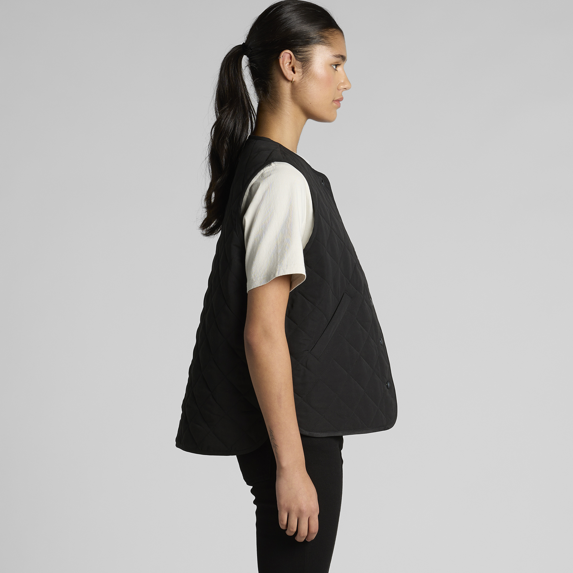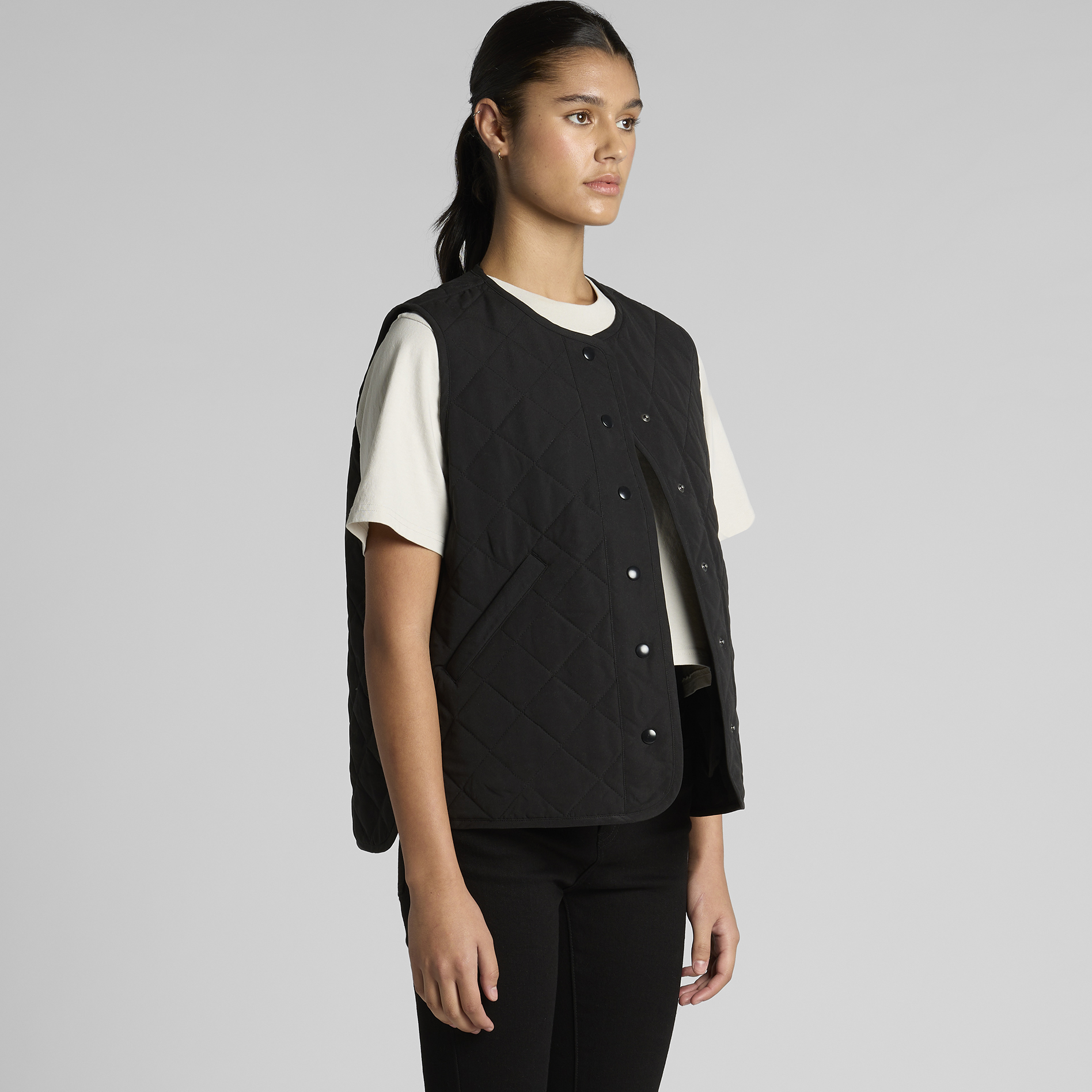 Women’s collarless quilted vest with a midweight recycled polyester lining and wadding, featuring a snap dome closure, two side pockets, and a curved hem.