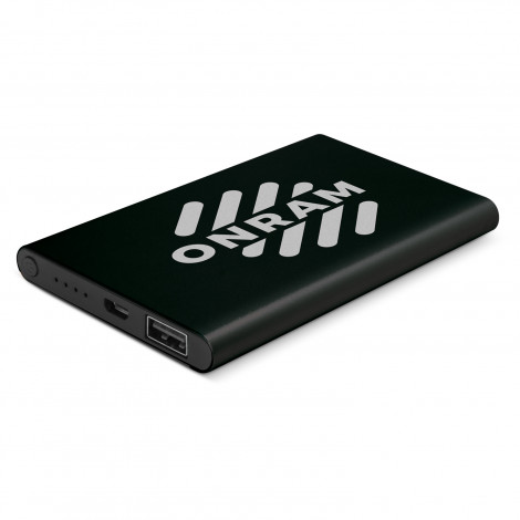 Thin 4000mAh power bank with a power gauge and a smart aluminium finish. The input power is 5V/1 Amp and the output power is 5V/1 Amp. It can be recharged in 5-6 hours from a USB port or a mains adapter. Comprehensive instructions and a Micro-B USB cable are included. An optional EVA carry case and a triple connector cable are available on request. Zion laser engraves to an oxidised white colour.