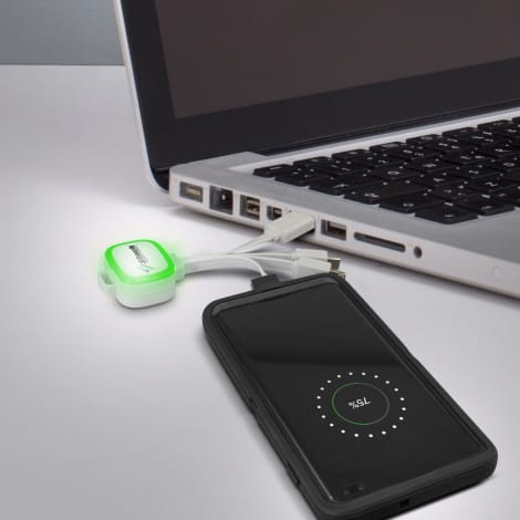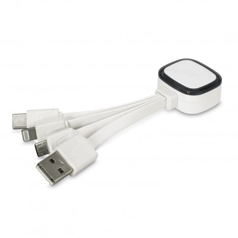 Trendy mobile charging cable which can be used to charge most phones. It has a translucent LED insert that lights up when it is in use and four different connectors. Zodiac has a USB connector cable, a Micro-B connector, a Lightning connector and a USB Type-C connector. This device is for charging only and is not designed for data connections. It can be customised with full colour branding and the choice of seven different coloured translucent inserts.